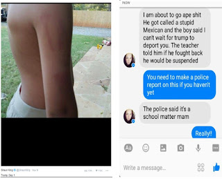 เด็กที่สนับสนุนทรัมป์ทำกับ ลูกชายของฉันขนาดนี้ ฉันแทบจะเป็นบ้าตายอยู่แล้ว ลูกถูกเรียกว่าเป็นไอ้พวกเม ็กซิกันงี่เง่า และเด็กชายคนนี้ยังบอกว่ารู ้สึกตื่นเต้นจริงๆ ที่ทรัมป์จะส่งตัวลูกฉันกลั บประเทศไป ครูบอกว่าถ้าลูกฉันสู้กลับจ ะถูกสั่งพักการเรียน ส่วนตำรวจบอกว่ามันเป็นเรื่ องภายในโรงเรียน ตำรวจไม่ขอเกี่ยวข้อง
