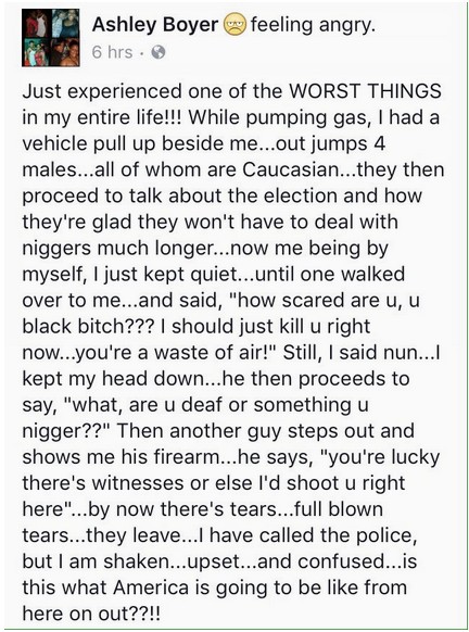 เพิ่งเจอประสบการณ์ที่เลวร้ ายที่สุดในชีวิตของฉันเลย!! ! ระหว่างยืนเติมน้ำมันอยู่ มีชายผิวขาว 4 คนออกมาจากรถ โดยพวกเขาเริ่มพูดกันเรื่อง เลือกตั้ง และเขาแสดงความรู้สึกว่าดีใ จที่ไม่ต้องวุ่นวายกับพวก “นิโกร” (เป็นคำดูถูกคนผิวสี) อีก ขณะที่ฉันยืนอยู่คนเดียว มีชายคนหนึ่งจากสี่คนเดินมา ที่ฉันแล้วพูดว่า “กลัวมากแค่ไหนล่ะ นังโสเภณีผิวดำ??? ผมควรจะฆ่าคุณเลยในตอนนี้ เสียดายอากาศที่คุณหายใจจริ งๆ นะ! ฉันไม่ได้ตอบโต้อะไร เอาแต่ก้มหน้า....ชายผู้นี้ พูดต่อไปอีกว่า “อะไรนะ หัวหนวกหรือไงนังนิโกร???” เขาพูด “คุณน่ะโชคดีแค่ไหนที่มีคนอ ยู่แถวนี้เยอะ ไม่งั้นผมจะฆ่าคุณตอนนี้เลย ” ในตอนนี้น้ำตาของฉันมันเริ่ มไหลไม่หยุด รู้สึกโมโหและสับสน.... นี่คือสิ่งที่กำลังเกิดขึ้น ในอเมริกาจากนี้เป็นต้นไปใช ่มั้ย?!!!